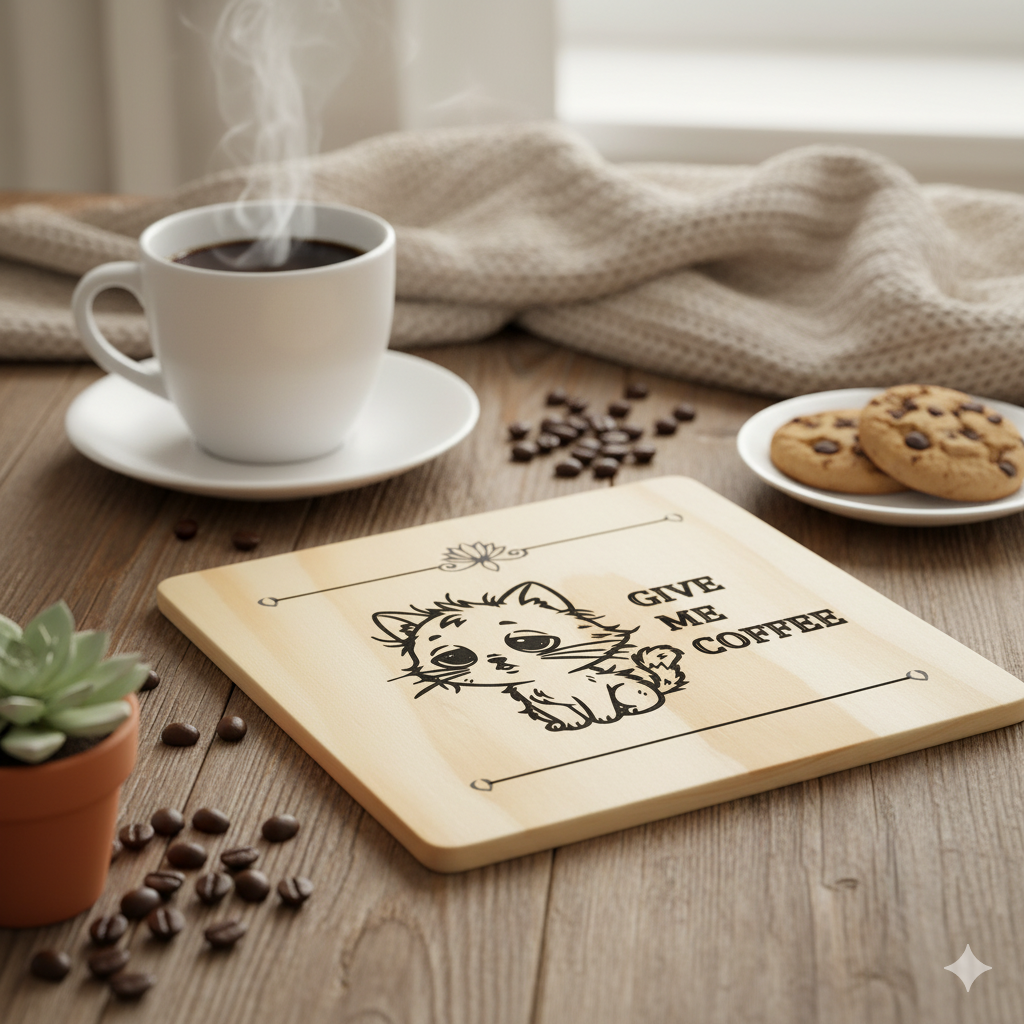 These charming wooden coasters bring personality and protection to your favorite surfaces. Crafted from natural pinewood, each coaster measures 4 inches by 4 inches with a sturdy 0.35-inch thickness that provides reliable protection against heat and moisture from hot coffee mugs, cold beverages, and everything in between. The playful cat design features an adorable feline companion with the humorous message "Give Me Coffee," making these coasters perfect for coffee lovers and cat enthusiasts alike. The natural wood grain adds warmth and character to any setting, whether you're enjoying your morning brew at the kitchen table, relaxing with tea in the living room, or entertaining guests. These versatile coasters complement a variety of decor styles from rustic farmhouse to modern minimalist. The smooth surface is easy to clean with a simple wipe, while the pinewood construction ensures durability for everyday use. Ideal as a thoughtful gift for the caffeine-dependent cat lover in your life or as a delightful addition to your own home collection.